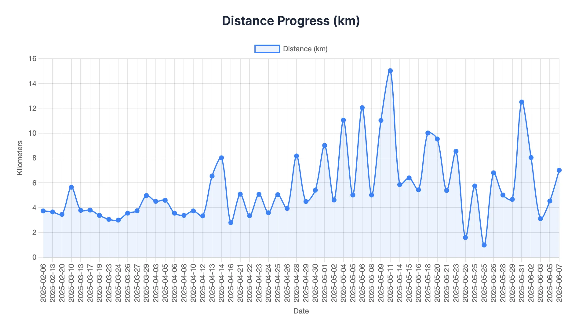 Looking at the first graph, which tracks my distance over time, tells the story perfectly. You can see the early days in April, where a 5km run felt like a major accomplishment. Then, heading into May, the line starts to climb. Those were the grinding weeks—pushing myself to 8km, then 10km, then seeing that 15km run appear on the chart. That was a huge mental barrier for me to break. The graph shows not just an increase in distance, but an increase in consistency and ambition.