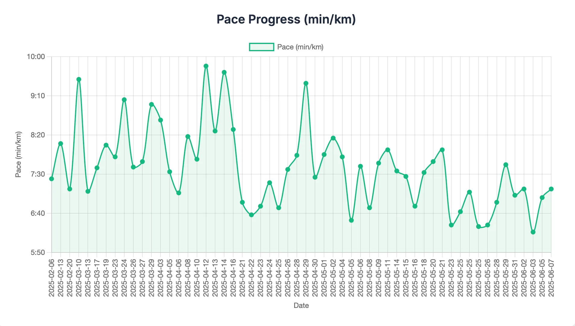 The second graph, tracking my pace, tells a different but equally important story. In the beginning, my pace was all over the place, often hovering around 8 or 9 minutes per kilometer, especially on hillier routes. But as the weeks went on, a clear downward trend emerged. The line shows how the hard work started to pay off. It’s not a straight line to victory, there are still tough days and slower runs, but the overall direction is exactly what I was hoping for.